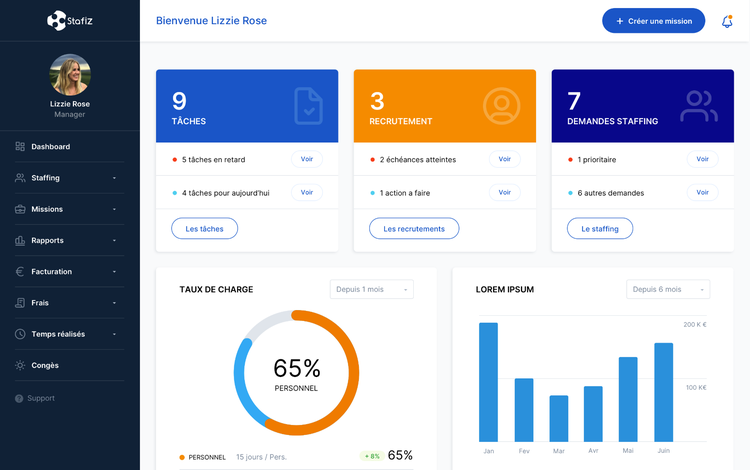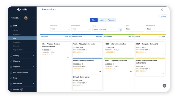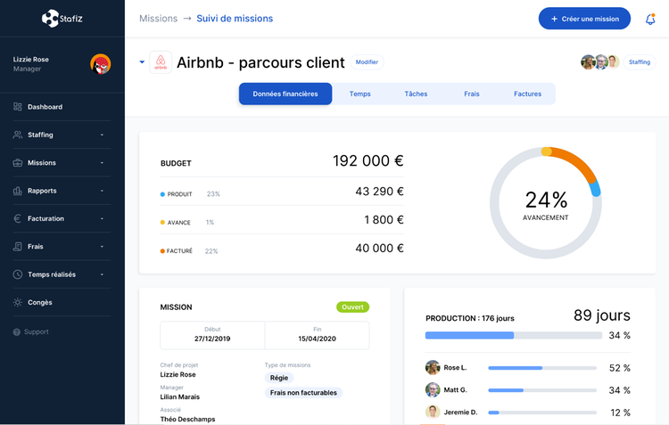 Pilotage, planification et facturation de projets Stafiz permet de piloter les projets dès la phase d'avant-vente, du devis jusqu'à la facturation. Stafiz permet de gérer la charge et la planification des projets et d'avoir une visibilité complète sur la situation financière des projets